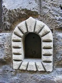 Buchettas are typically of similar dimensions, about 30 centimetres (12 in) tall and 15 centimetres (5.9 in) wide, and arched at the top, but are otherwise very diverse in style. They were usually built into the streetside walls of the palaces of aristocrats, usually near the main entrance, and may be quite ornate. They were closed outside of opening hours with a hatch, which might be painted various colours, or with a still life or religious painting. Many hatches are now missing, and some buchettas are disused and have been sealed off.[5]