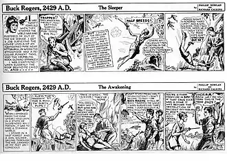 On January 7, 1929, the Buck Rogers in the 25th Century A.D. comic strip debuted.[6] (Coincidentally, this was also the date that the Tarzan comic strip began, distributed by United Feature Syndicate.) Buck Rogers was initially syndicated to 47 newspapers.[9] On March 30, 1930, a Sunday strip joined the Buck Rogers daily strip. During initial syndication in 1929, some newspapers referred to Rogers as "Rip Van Rogers" due to the 500 year time skip.[10]