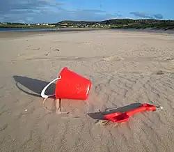 Bucket and spade sets are traditional British seaside paraphernalia that can be bought cheaply from any beachside vendor. They usually consist of a small plastic bucket with a handle and a small shovel, sometimes decorated with a variety of bright colours and patterns. In North America, they are called shovels with pails.[1]