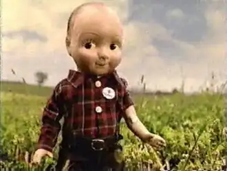 The comedic ads touted the unmoving Buddy Lee as a "Man of Action." The doll was usually presented as a heroic figure who survived all manner of certain doom, prompting his human co-stars to marvel at the durability of his jeans. Three nemeses for Buddy Lee – Curry, Roy, and Super Greg (the latter portrayed by Sacha Baron Cohen).[1] – were introduced in 2000 through Web sites and appeared in three TV spots directed by Fredrik Bond.[4] Archived 2009-07-24 at the Wayback Machine