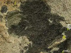 Buellia badia, the parasitic button lichen, is a dark chocolate-brown crustose areolate lichen of Europe, northern Africa, and North America that starts as a parasite growing on other lichens, such as Aspicilia phaea, gradually then becoming independent growing on rock (sometimes also on hardwood.[1]: 229  [2] Areoles may be contiguous or dispersed.[2] Lecideine apothecia are 0.3 to 0.9 mm in diameter with black discs, that are initially flat, then become strongly convex as they age.[2] Lichen spot tests are all negative.[1]: 229  There are no known secondary metabolites as of (2001).[2] It is similar in appearance and other ways to the chocolate brown Dimelaena californica, which also starts off as a parasite on other lichens, and has spores of similar shape, size, and internal construction.[2] D. californica has not been found on wood, is more preferential as to the lichens it starts growing on (usually Dimeleana radiate), and commonly has norstictic acid as a secondary metabolite.[2] Some think they should be included in a new, third genus.[2]