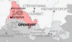 The Buguruslan constituency (No.143[a]) is a Russian legislative constituency in Orenburg Oblast. Until 2007 the constituency covered western Orenburg Oblast; however, in 2016 the constituency took parts of Orenburg and was reconfigured to northwestern Orenburg Oblast.