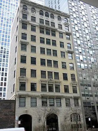 The Building at 257 East Delaware is a historic apartment building located at 257 East Delaware Place in the Near North Side neighborhood of Chicago, Illinois. The building was built in 1917 during a wave of luxury apartment construction on the Near North Side. Architect John Nyden designed the Renaissance Revival building, which was one of Chicago's first luxury apartments designed in the style. Like most skyscrapers of the area, the ten-story building is split into three parts visually; the upper two and lower two floors are faced with terra cotta and are connected by a brick shaft. The building is topped with a cornice and balustrade. Terra cotta lintels and decorations add an Adamesque influence to the building.[2]