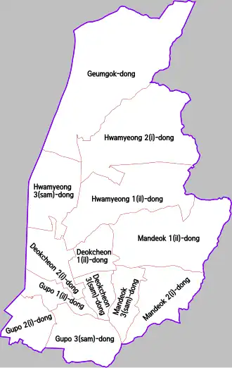 Buk District is divided into 5 legal dong and further subdivided into 13 administrative dong as follows:
