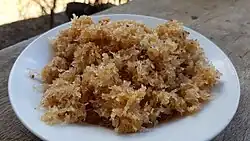Bukayo is a Filipino dessert made from sweetened coconut strips. It is traditionally made by simmering strips or shredded bits of young, gelatinous coconut (buko) in water and sinuklob, which is sugarcane muscovado melted into a chewy caramel-like consistency.[1][2][3][4] Dryer versions of bukayo with a crumbly texture are known as bocarillo.[4] Bukayo can be eaten on its own, usually rolled into little balls. It can also be used as a garnish and filling for other desserts, most notably for pan de coco, moche, and sinudlan empanada.[2][5]