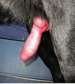 The bulbus glandis (also called a bulb or knot) is an erectile tissue structure on the penis of canid mammals.[1][2][3][4][5][6] During mating, immediately before ejaculation the tissues swell up to lock (tie) the male's penis inside the female. The locking is completed by circular muscles just inside the female's vagina; this is called "the knot" tightening thus preventing the male from withdrawing. The circular muscles also contract intermittently, which has the effect of stimulating ejaculation of sperm, followed by prostatic fluid, as well as maintaining the swelling of the penis and therefore the tie, for some time. For domestic dogs the tie may last up to half an hour or more, though usually less.[7] When male canines are sexually excited, the bulbus glandis may swell up inside the penile sheath, even if the dog has been neutered.[8]