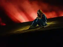 The Bulgarian performance featured Victoria performing on a rotating platform in a blue jacket and pants.[15] The LED stage floor displayed water and Victoria stroked a picture of her and her father from her childhood during the song. The performance also featured smoke and an hourglass effect, which a stream of sand was poured in onto the stage with Victoria reaching and touching it.[16][17] The stage concept of the Bulgarian performance was developed by Austrian director Marvin Dietmann.[18] An off-stage backing vocalist also joined Victoria: the co-composer of "Growing Up Is Getting Old" Maya Nalani.[19]