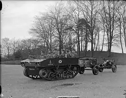 Throughout the 1920s and 1930s, the battery served as a separate unit, rotating through the five remaining battery stations of the RHA at Meerut, Risalpur, Sialkot, and Trimulgherry in India and St John's Wood Barracks in London.[41] Mechanisation of the RHA began in 1934 and by 1936 the battery – now at Risalpur – had been given a mix of equipment: two sections[h] had 18 pounders and one had 3.7" Howitzers towed by Light Dragon gun tractors.[42]