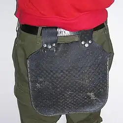 The term bum flap or butt flap refers in one usage to the rear flap in a union suit, In this usage, it is also sometimes termed as crap flap, evacuation flap, or with some other euphemism.[1] In another usage (train hopping), the term refers to a piece of removable material that hangs from the waist to cover a person's buttocks. The external flap is of ambiguous origin, but probably was originally intended to reduce abrasive wear to pants. Sitting or sliding on a rough surface can rapidly wear the seat of pants, and flaps act as replaceable buffer material. They also provide some protection from damp or cold surfaces. The freely swinging flap dries faster than wet pants, and can be easier to clean. Bum flaps are often worn as a superfluous fashion statement, usually emblazoned with punk iconography.