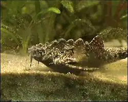B. coracoideus is the most common species of banjo catfish found in the aquarium fishkeeping hobby.[3][4] These fish are nocturnal.[5] This species is peaceful and a good idea for a community aquarium.[4] These fish may be kept with sand to allow them to bury themselves or with a flat rock to hide underneath.[4] Reproduction has been accomplished in the home aquarium. These fish can be easily sexed because females are much fatter and fuller than males. The mating pair should be conditioned on live foods for at least a month.[5] Spawning is induced by a larger water change; the pair will spawn within two days.[5] Spawning occurs at night.[4] Some sources say they spawn under a fallen leaf or on a large rock, incubating their eggs by sitting on them, while others list them as egg-scatterers.[4][5]