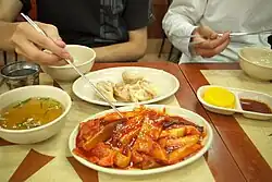 In Korean cuisine, bunsik (Korean: 분식) are inexpensive dishes available at bunsikjeom (분식점) or bunsikjip (분식집) snack restaurants.[1] Bunsik literally means "food made from flour," referring to dishes such as ramyeon (라면; noodle soup) and bread, but modern bunsik restaurants serve other dishes in large portions at low prices, such as gimbap, tteokbokki, rabokki (tteokbokki with ramyeon), sundae, eomuk, and twigim. One bunsikjip chain is called "Gimbap Cheonguk".[2]