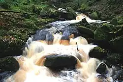 It continues down the valley and below the A6187 at (lower) Burbage Bridge, close to a rock feature known as Toad's Mouth and the associated Toad's Mouth prehistoric field system, where it re-enters Derbyshire at Lawrence Field.[6] It then flows into Padley Gorge, Derbyshire, as it passes through the Longshaw Estate. The woodland around the brook, Yarncliff Wood, at this point is also a SSSI and a breeding site for pied flycatcher, wood warbler and hawfinch.[7] At Upper Padley, before it flows into the river Derwent, it flows close to Grindleford railway station and Padley Chapel.