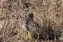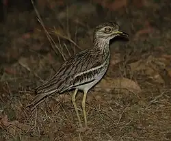Burhinus are a genus of long-legged, large-eyed, terrestrial waders with eerie nocturnal calls. They range from 32 cm (Senegal thick-knee) to 59 cm (Bush stone-curlew).[3][4] There are generally only minor plumage differences between the sexes, and the late juveniles of Burhinus appear similar to the adults. Females may be smaller.[4] All species of this genus have cryptic plumage of sandy browns with streaks and mottles, usually with spots of cream, buff, brown and black. The head of the Burhinus has a broad domed crown, giving rise to the Afrikaans name of dikkop, which translates to "thick head".[3][4] The closed wings of most Burhinus have banded upper coverts. This is not as prominent on the American species and the Peruvian thick-knee is plainer and greyer except for the head. In flight, Burhinus’ wing plumage is much more striking with patterning that contrasts with the otherwise cryptic plumage. All Burhinus have black primary feathers with white patches, which is most developed in Bush stone-curlews. The wings are long and are held straight and out stretched in flight. Burhinus have a marked carpal angle and the outer wing has minimal tapering, with a pointed tip in some species. The inner wing is thinner, with 16-20 secondary feathers. Burhinus have 11 primary feathers, of which the outer most is very small and covered by the primary coverts. The twelve tail feather are generally short and rounded, except in the Spotted thick-knee which is medium in length and the Bush stone-curlew which has a longer more tapered tail. Their legs often extend beyond the tail in flight.[3][4]