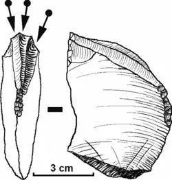 A type of burin diagnostic of the archaeological stratum where they are found is the "Noailles" burin, named for its original find-site, the Grotte de Noailles, in the commune of Brive-la-Gaillarde, Corrèze, in southwestern France.[3] It consists of a small multiple burin characteristic of the Upper Paleolithic cultural stage called the Gravettian, ca. 28–23,000 BC; these flake tools have been restruck and refined to give several chisellike edges and a blunt, grippable rear edge.