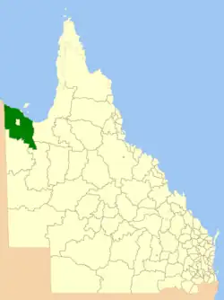 The Doonmunya Division was created on 11 November 1879 as one of 74 divisions around Queensland under the Divisional Boards Act 1879 with a population of 396.[8] However, the divisional board appeared to be completely inactive, perhaps because the division was so large (being the area surrounding the southern part of the Gulf of Carpentaria) and was very sparsely settled.[9] Nonetheless some of the citizens were unhappy about this.[10] Consequently, on 11 January 1883, the Doonmunya Division was abolished and a new Carpentaria Division was created to replace it.[11][12][13]