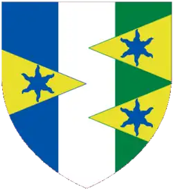Tierced per pale Azure Argent and Vert three piles one issuing from the dexter and two from the sinister Or each charged with an estoile Azure.