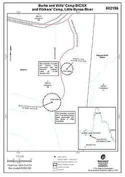 Burke and Wills' Camp B/CXIX and Walker's Camp are located 35 kilometres (22 mi) south-west of Normanton. They are about 2 kilometres (1.2 mi) south of the Normanton-Burketown Road and close to the Little Bynoe River. The sites are located above the waterline on small, seasonal overflows of the river.[1]