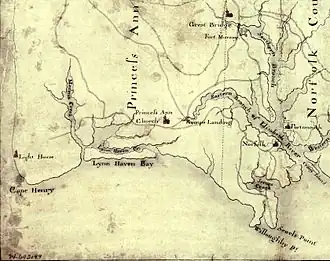 ![]() Detail from a 1775 map showing the Norfolk area. Oriented with North to the bottom, Great Bridge is visible near the top of the map, and Norfolk is center-right. | |