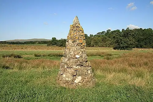 Memorial dedicated to John Lapraik (1727-1807) poet and friend Robert Burns, who lost his money with the collapse of the Ayr Bank and had to leave his farm. The inscription on the plaque reads:[35] THIS CAIRN WAS ERECTED AD1914