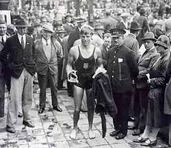 Crabbe competed in two Olympic Games as a swimmer. At the 1928 Summer Olympics in Amsterdam, he won the bronze medal for the 1,500 meters freestyle, and at the 1932 Summer Olympics in Los Angeles, he won the gold medal for the 400 meters freestyle when he beat Jean Taris of France by a tenth of a second.[4][5]