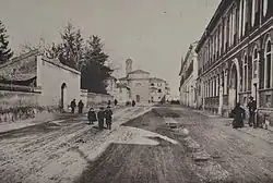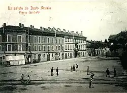 This was the name given to the open space in front of the church of San Gregorio Magno in Camposanto, which occupied the south-western part of what is now Piazza Trento e Trieste, outside the south-eastern end of the ancient fortifications. This clearing was present in the Teresian Cadastre, while the remaining part of Piazza Trento e Trieste was occupied by fields. In the 1857 Cadastre, the current layout is outlined, with the entire square already fronted by real estate; Luigi Ferrario named it Piazza di San Gregorio.[32] In the meantime, the vestry board of San Giovanni had purchased a piece of land in the Cassina Scerina near the church of San Gregorio and began the construction of an oratory and the opening of a kindergarten named after Saint Anne with the entrance facing the meadow of San Gregorio, which began its activity in 1860. Between 1859 and 1861, today's Piazza Trento e Trieste was named after Camillo Benso, Count of Cavour, a name that remained until 1896, when a street in the historic centre was named after Cavour. Regardless of the official toponymy, at least since 1860 the square was commonly referred to as Piazza dell'Asilo, and this name persisted until the early 20th century. In 1909, the square assumed its current name of Piazza Trento e Trieste. Carlo Azimonti reports another popular denomination of the square, namely Prà Furnè, which is explained by the presence on the square of the Cantoni bakery in Prà Asìli.[33]