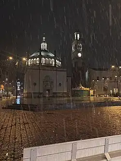 It corresponds to today's Piazza Alessandro Manzoni and its origin dates back to the 17th century following the levelling of the embankment that surrounded the village of Busto Arsizio to the west. It rises in correspondence with the town gates of Sciornago and Pessina and until 1876 was indicated on maps as Prato Pessina (in the Book of Tithing of 1399 it was Pratum de Pessina), in continuity with the ancient name of the adjoining Piazza San Michele. The name Piazza della Fiera (Fair Square), documented since 1876, derives from the presence in this square of the cattle market, a veritable fair especially on the occasion of the feast of St Roch, which was celebrated with the blessing of the cattle at the nearby church of St Roch. The current dedication of the square to Alessandro Manzoni dates back to 1906.[22]