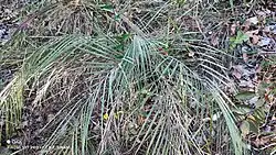 It is extremely similar to Butia capitata, juvenile specimens of that species being very easy to confuse with this one. According to Soares in 2015 the main difference between these two species is that B. matogrossensis has much smaller fruit with a purplish hue, compared to the big yellow fruit of B. capitata.[1] Noblick in his 2014 key to the genus Butia also contrasts it to B. capitata, distinguishing the two species from each other by B. matogrossensis having a usually subterranean trunk, a shorter leaf rachis, less pinnae, a smaller swollen portion of the spathe, much less rachillae and the ripe fruit being green or purplish-green as opposed to yellow.[6] It is also very similar to B. arenicola, but is much larger than this dwarf species.[1] Marcelo Piske Eslabão in his 2017 key to the genus contrasts it to B. arenicola, distinguishing the two species by B. matogrossensis having generally red fruit as opposed to yellow, and a petiole almost twice as wide, a spathe over twice as wide, and larger pistillate flowers.[2]