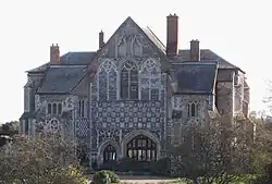 Standing centrally on the priory's northern precinct boundary,[74] the gatehouse was built in the early 14th century to provide a grand entrance and to accommodate important visitors.[75] Substantially original, it is called one of the finest examples of Decorated Gothic architecture in Suffolk,[76] and one of the most complete and interesting monastic entrances surviving.[77] Its exuberant flint flushwork is the first blossoming of that technique, later so widespread in East Anglian religious architecture, and its heraldic display was ambitious in content and architecturally innovative. The impressive rib-vaulted central entrance passage and side chambers dictated the need for large external buttresses. A portal between the temporal and cloistered worlds, the Gatehouse was in its time a prestigious addition to the priory, and remains a monument to the priory itself and to the taste and resources of its patron. It also attracted some distinguished visitors.