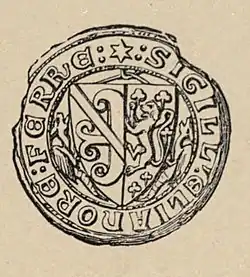Sir Guy died without heir male in 1323 and (as stipulated in the 1289 grant of Gestingthorpe) his manors, except his entails of 1308, passed by reversion or escheat. But as Elianore Ferre held Benhall with him jointly, it remained wholly to her for her life under the Honour of Eye.[104][105] An example of her personal seal survives, attached to a document issued from Benhall in 1348. Her name inscription surrounds a shield bearing arms of Guy Ferre the younger impaled with a coat blazoned by Robert Glover for "Mountender", and by Charles Segoing (a French herald of the 17th century) for a family of the township of Montendre in the Saintonge frontier of English Aquitaine.[106] Two wyverns support the shield, as in the Butley armorials.