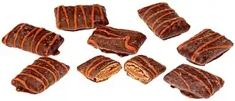 Butterfinger is a candy bar manufactured by the Ferrara Candy Company, a subsidiary of Ferrero. It is manufactured internationally by Nestlé.[1] It consists of a layered crisp peanut butter core covered in a "chocolatey" coating (it is not eligible to be referred to as chocolate, as it contains no cocoa butter).[2][3] It was invented by Otto Schnering of the Curtiss Candy Company in 1923. A popularity contest chose the name.