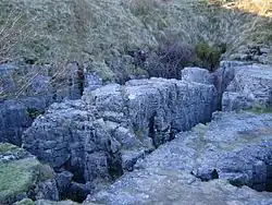 The Buttertubs Pass is a high road in the Yorkshire Dales, England. The road winds its way north from Simonstone near Hawes towards Thwaite and Muker past 20-metre-deep (66 ft) limestone potholes called the Buttertubs. It is said that the name of the potholes came from the times when farmers would rest there on their way to market. During hot weather they would lower the butter they had produced into the potholes to keep it cool.