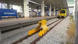 A cross-strait ferry service provides a direct link between Butterworth and George Town. The Port of Penang handled 1.52 million TEUs of cargo as of 2017, making it one of the busiest seaports in Malaysia.[7] In addition, the Butterworth railway station, situated adjacent to the town's ferry terminal, is a major Malayan Railway station, with train services operated by both the Malayan Railway and the State Railway of Thailand.