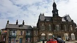 Buxton is a spa town in the Borough of High Peak, Derbyshire, in the East Midlands region of England. It is England's highest market town, sited at some 1,000 feet (300 m) above sea level.[1][nb 1] It lies close to Cheshire to the west and Staffordshire to the south, on the edge of the Peak District National Park.[1] In 1974, the municipal borough merged with other nearby boroughs, including Glossop, to form the local government district and borough of High Peak.