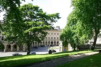 The Dukes of Devonshire became involved in 1780, when William Cavendish, 5th Duke of Devonshire used profits from his copper mines to develop it as a spa in the style of Bath. Their ancestor Bess of Hardwick had brought one of her four husbands, the Earl of Shrewsbury, to "take the waters" at Buxton in 1569, shortly after he became the gaoler of Mary, Queen of Scots, and took Mary there in 1573.[11] She called Buxton "La Fontagne de Bogsby". She stayed at the site of the Old Hall Hotel, where Earl of Shrewsbury had built a lodging for visitors.[12] According to John Jones of Derby, author of Buxtone's Bathes Benefyte (1572), the visitors to Shrewsbury's "goodly house" enjoyed a game of table bowls known as trou madame.[13]