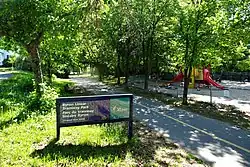 Byron Linear Tramway Park is a municipal park in Kitchissippi Ward and Bay Ward in Ottawa, Ontario, Canada. The park forms a narrow strip of park land that runs westward from Holland Avenue to Richardson Avenue in Woodpark, with the exception of Westboro Village (between Churchill and Golden Avenues). Running through the entirety of the park is a path through grass and trees. The park forms a narrow 2.5 km strip, but has a width varies between 5 and 15 metres.