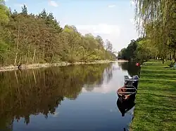 The canal is a fairly lively stream channel at the beginning. Just below the weir, and the bridge carrying 29 Listopada Street (National Road 8, National Road 16, and European route E67) over the canal, it is a series of shoals and rocks with a width of approximately 40 m (130 ft). A street named after Ludwik Waryński, an activist and theoretician of the socialist movement in Poland, runs along the right bank of the canal. There are a number of houses along the edge of the water with a number of small private docks for boats and for fishing.