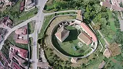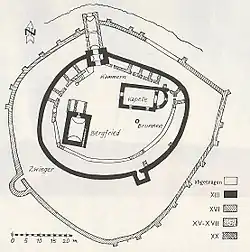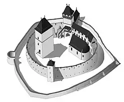 The Mongol invasion of 1241 prompted a surge in military construction in Transylvania, with wood and earthen defenses abandoned in favor of stone, assembled in haste and without much initial attention to artistic detail.[1] At Câlnic, the fortress began as a residence for a Graf (count), one of the last such to be built in Transylvania. Around 1270, the nobleman Chyl of Kelling, whose family gave the village its German name, built a keep for his residence.[2] The strong parallelepiped structure, with a ground floor and three floors for living space, came to be known as the Siegfried tower.[3] Frequent Ottoman attacks led the keep to be fortified with a defensive level and surrounded by a massive wall.[2] The oval precinct around the keep was fitted with a guard tower to the south and a gate tower to the north.[1][3] The structure was surrounded by a water-filled moat, with access only by drawbridge. The noble owners never went along very well with the local notables, and in 1430, the final Graf sold the fortress to the villagers and moved out.[2]