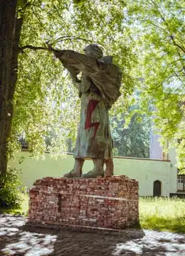 Like Halka/Haiti, the allegorical film and public installation Who is Afraid of Natasha? (2021, Triennial Brugge) re-staged a cultural fragment from one context to another.[24] The artists reimagined a well-known monument nicknamed "Natasha"—a modest, bronze Socialist Realist-style figure that stood in a prominent public square in Gdynia, Poland from 1953 to 1990—and re-sited it to Bruges, with the addition of a red lightning bolt sprayed on the right side of the figure's dress, symbolizing support for recent large-scale women's protests in Poland. The project's film revealed a complex composite portrait whose different narratives included the statue's original purpose to celebrate the WWII Soviet-Polish alliance, its subsequent association with an oppressive communist regime, and potential new stories stemming from the reconstruction, new location and era.[24][41]