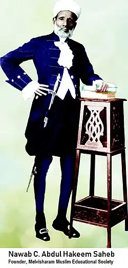 Nawab C. Abdul Hakeem Saheb (1863–1938), one of the respected natives of Melvisharam, Prince among traders and one time Sheriff of Madras. He was a Tamil Muslim trader and politician from the Madras Presidency. He set up a tannery in 1907 and emerged as a prosperous businessman serving as President of the Southern Indian Chamber of Commerce. He founded the Melvisharam Muslim Educational Society in 1918 with a golden dream of transforming his town into a splendid seat of great learning to cater to the educational needs of youth. Like the winds that have no barriers of caste or community, the Nawab’s generosity lighted the lamp of joy and contentment in several poverty-ridden families. His colorful dreams have all been realized by the Melvisharam Muslim Educational Society that strove hard to transform Primary, Secondary and Higher Education into splendid segments of pristine enlightenment irrespective of caste, creed, community or social status. The work continues even now with zeal and rejuvenating spirit.[1]