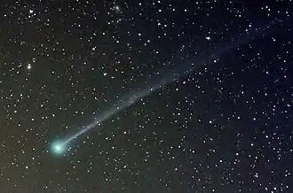 C/2025 F2 (SWAN) is a comet that was discovered from images taken by SOHO's SWAN instrument in late March 2025. The comet was expected to reach a peak magnitude of about 5 in early May 2025,[5] however its brightening stagnated in mid April, indicating the comet possibly disintegrated before reaching perihelion.[6]
