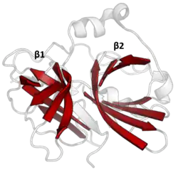 The structure of TEV protease has been solved by X-ray crystallography.[5] It is composed of two β-barrels and a flexible C-terminal tail and displays structural homology to the chymotrypsin superfamily of proteases (PA clan, C4 family by MEROPS classification).[2] Although homologous to cellular serine proteases (such as trypsin, elastase, thrombin etc.), TEV protease uses a cysteine as its catalytic nucleophile[6] (as do many other viral proteases).