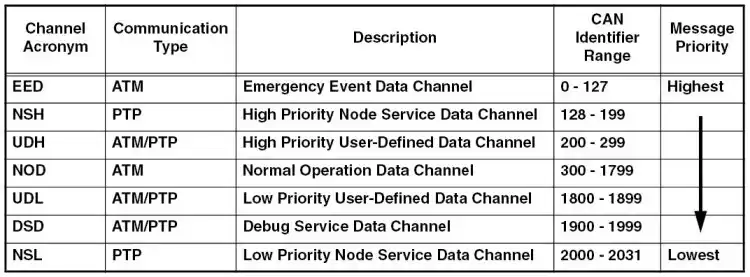 - High/Low Priority User-Defined Data Channel (UDH/UDL): This channel is dedicated to communication which cannot, due to their specific characteristics, be assigned other channels without violating the CANaerospace specification. As long as the defined identifier range is used, the message content and the communication type (ATM, PTP) for these channels may be specified by the system designer. To ensure interoperability it is highly recommended that the use of these channels is minimized.