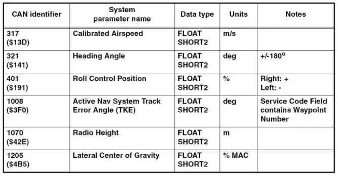 The above information contained in the CANaerospace message header contains important information to determine the integrity of the parameters for the use in flight safety critical systems and supports system redundancy. Additionally, it significantly improves the interoperability between LRUs of different vendors and allows the monitoring of CANaerospace networks concerning the status of the LRUs attached to it. For further interoperability, CANaerospace defines aerospace specific axis systems with the corresponding sign conventions and physical units. Together with the predefined identifier assignment list, these definitions describe the traffic in a CANaerospace network unambiguously. The CANaerospace Standard Identifier Assignment List reserves the CAN identifiers between 300 and 1799 and assigns parameters to them as shown in the excerpt of this list (Figure 4).