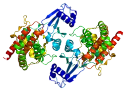 The CHKB gene is located on the q arm of chromosome 22 at position 13.3 and it spans 4,041 base pairs.[7] The CHKB gene produces a 7 kDa protein composed of 60 amino acids.[10][11] The structure of the protein has been found to be a homodimer, and forms a heterodimer with the CHKA protein.[9][8] It has also been found to contain multiple highly conserved domains, such as a Brenner phosphotransferase consensus sequence essential in catalytic function.[12]