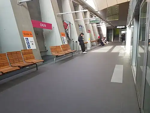 CHUV is a Lausanne Métro station on M2 line. It was opened on 27 October 2008 as part of the inaugural section of the line, from Croisettes to Ouchy–Olympique. The station is located between Sallaz and Ours.[1] The name of the station originates from the Lausanne University Hospital, Centre hospitalier universitaire vaudois in French.