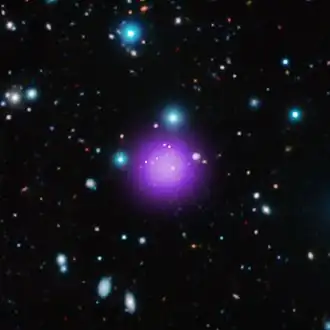 CL J1001+0220 is, as of 2016, the most distant known galaxy cluster.[1] Discovered in 2016 by the Chandra X-ray Observatory in conjunction with the ESO's UltraVISTA telescope and the Atacama Large Millimeter Array, it has a redshift of z=2.506, placing it at a distance of 11.1 billion light-years from Earth. The galaxy cluster appears to be undergoing the transformation from a galaxy cluster that is still forming, a proto-cluster, to a mature cluster, and it is the first such cluster observed in this stage of its evolution.