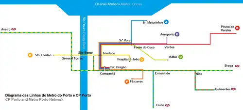 - ^ CP, "Mapa das Linhas dos Comboios Urbanos do Porto" (Porto Urban Trains Lines Map) "Archived copy" (PDF). Archived from the original (PDF) on 30 October 2010. Retrieved 31 August 2010.