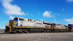 ![]() Citirail locomotives pulling an intermodal train out of Winnipeg | |