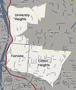 The term "CUF" is rarely, if ever, used by locals.[1] Although inaccurate, these neighborhoods, along with Corryville, are often referred to as being part of Clifton, even by long-term residents.[1]
