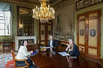 It has been customary since 1971 that after being sworn in, the new team of ministers is photographed together with the king/queen during the 'bordes scene'.[15] Afterwards the ministers go to their department where the official transfer takes place. For example, the Minister of Finance hands over the key to the treasury and the new prime minister receives the key to the office in the Torentje. A proces-verbaal of transfer is signed by both ministers.[16]
